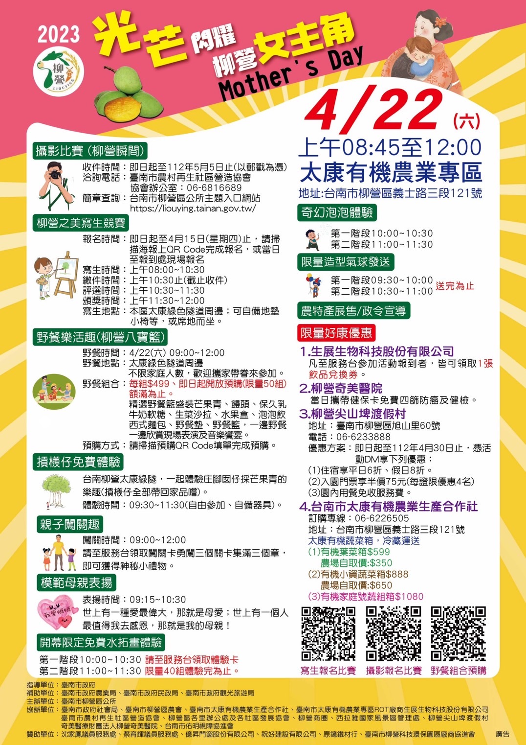 2023年4月22日(六)柳營區太康綠隧芒果節於太康有機農場盛大登場,特色活動「打芒果」吸引許多親子一同體驗。主辦單位柳營區公所邀請民眾自備用具參加,打下的芒果皆可打包帶回家。當天也有母親節頒獎活動、攤位擺攤、闖關遊戲等,十分熱鬧。