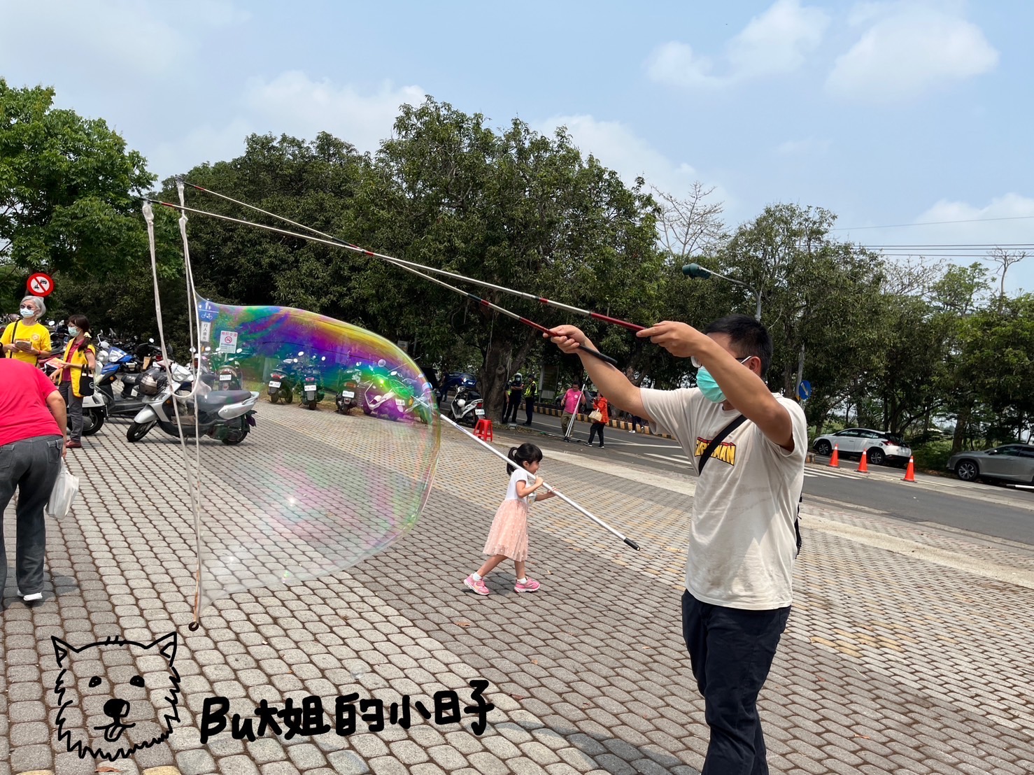 現場還有親子泡泡體驗區,我們體驗用長棍控制棉繩,拉出大泡泡,很有成就感。