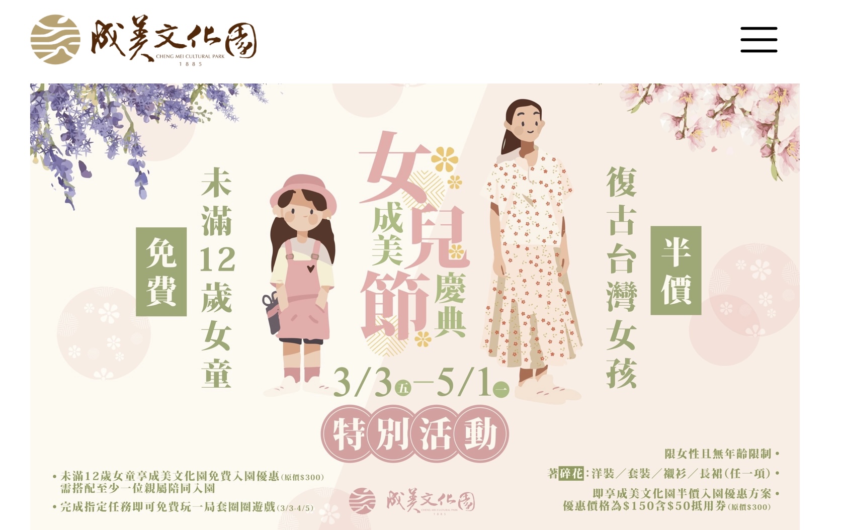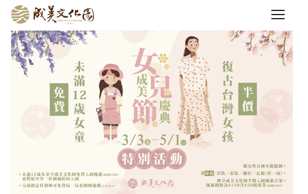 位於彰化永靖的成美文化園區,為日式庭院風格設計園區,為慶祝女兒節,於2023年3月3日-5月1日,凡女性、不限年齡,著「碎花」洋裝/套裝/襯衫/長裙入園,享半價入園門票方案,每人特惠價150元,內含50元園區折價券(原價300元)。