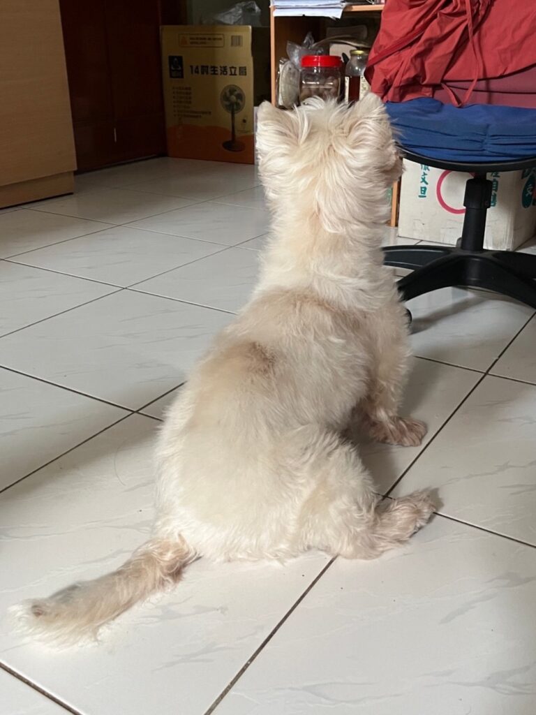我們邊煮飯,Bu就會聞香而來,在廚房地上乖乖等,或是跟著我們的身影繞,跑過來跑過去,就怕錯過美食。偶爾食物太香,還偷偷前腳一登,往椅子上跳,希望能一嚐桌上的美食。年紀漸長,Bu雖然比較沒有體力,也會乖乖在廚房外等,餐桌下不會缺少他的乖乖等待的身影。
